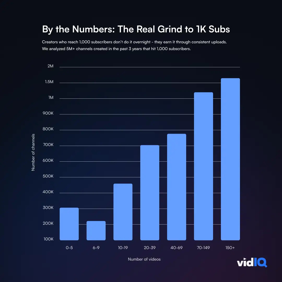 Here’s where it gets interesting: nearly 7 out of 10 channels (68%) that reached 1,000 subscribers had uploaded more than 40 videos.